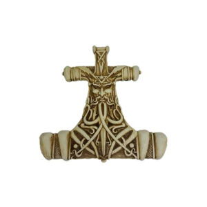 This grand Thor’s hammer is antique white bone color with brown highlights and has deep design relief for quality detail for viewing near or far. Cold cast resin comes with attached metal loop for mounting on wall or door. 11 3/4″ x 11 3/4″