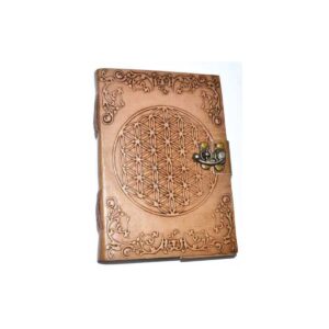 This Triple Moon blank leather journal, is garnished with opalite inside it’s center full moon, encircled by leather woven stitching, with the embossed crescent moons on top and bottom, it’s border are designed with Celtic tooled edging .The back cover is adorned with flowers in the center of a triangle pattern. It’s spine edge has…