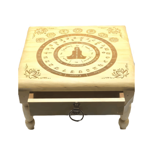 Imagine having a sacred space that not only elevates your spiritual practice but also keeps your cherished items safe and organized. The 12x 12″ Pendulum altar table is designed to do just that. With its elegantly laser-engraved dowsing top and convenient drawer, this altar table becomes an essential part of your spiritual journey. Looking for more altar tools & supplies? Explore our collection to complement your altar setup.