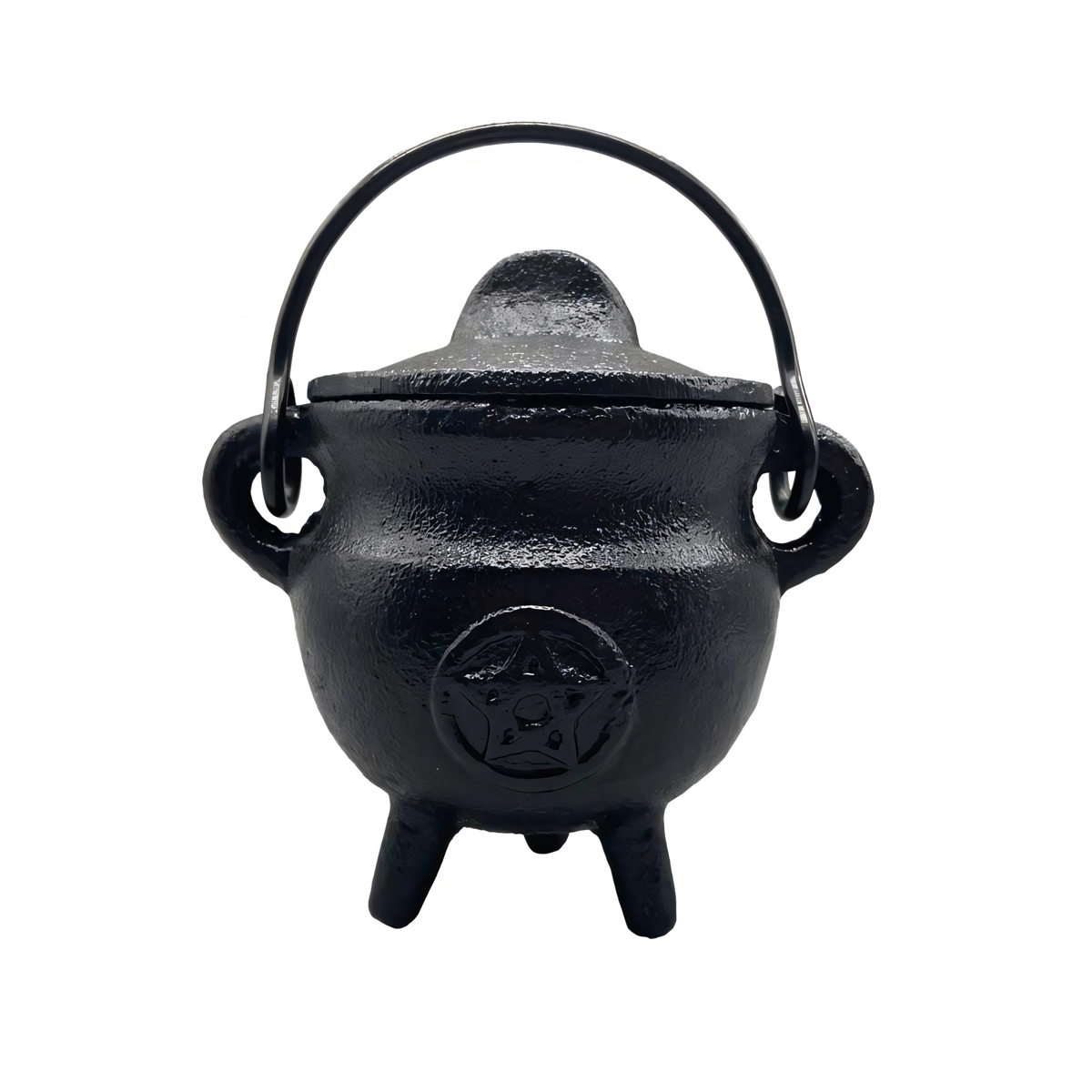 The cast iron body absorbs and holds heat, so anything involving charcoal, herbs, or small ritual fires happens in one clearly defined place. The lid and three peg legs reinforce that containment: ash and residue stay in the pot, not all over your altar. The pentagram stamped on the front works as a visual cue, not a guaranteeโeach time you see it, youโre reminded that whatever goes in this vessel is being deliberately handled, not passively ignored.