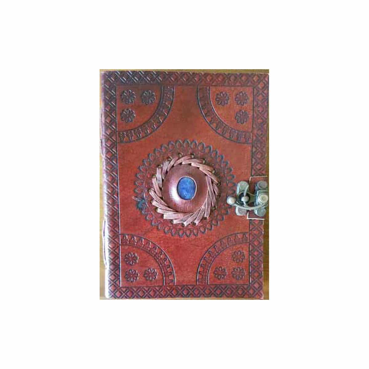 Hand tooled blank leather journal with varied embossing & embedded stone. Border embossing may vary. Size may vary slightly. Leather, handmade paper. 200 pages, latch closure, stones will vary. 5” x 7”