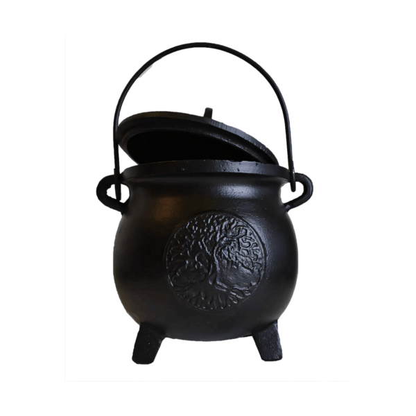 - Material: Cast iron cauldron with Tree of Life design, lid, and handle