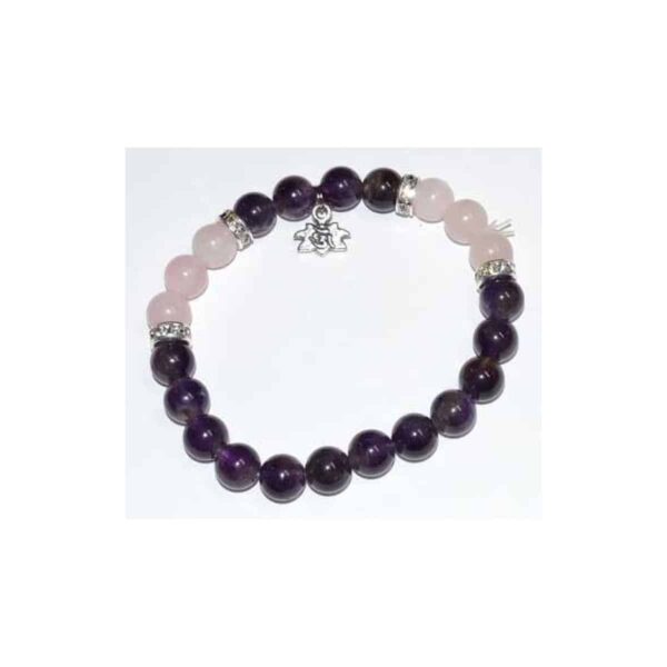 This is a soothing, yet powerful bracelet. The lotus is a powerful symbol of purity, enlightenment and rebirth. Amethyst will assist you with happiness, calming fear, emotional storms, courage, love, peace, addiction, dreams, helps with insomnia and nightmares. Rose Quartz will flood you with the energy of unconditional love, and keep your heart clean. 8mm Beaded bracelet with a silver toned lotus and accent pieces. Made in China.