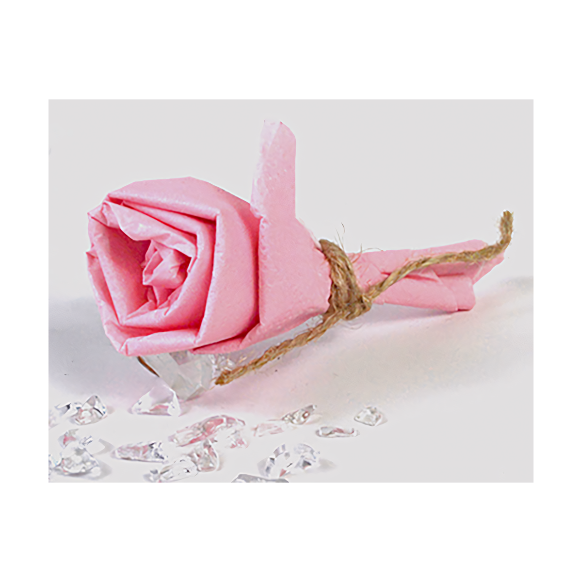 - One handcrafted pink rose, approximately 3″ in size