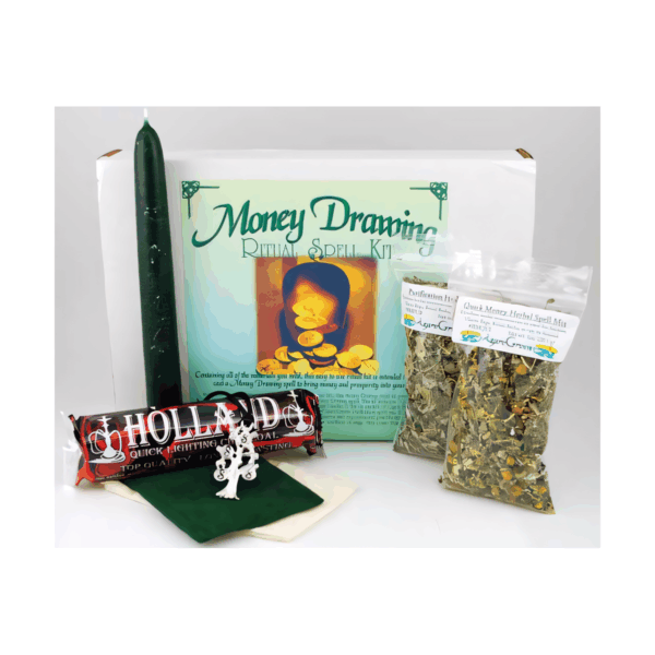 - Complete Money Drawing Boxed ritual kit with coordinated components.