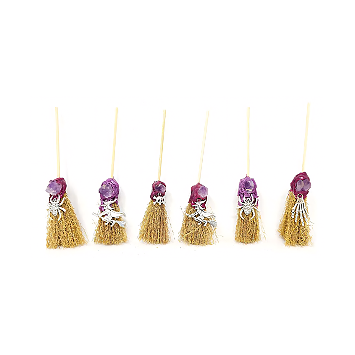 Stay clear on what’s happening: this is a set of six small altar brooms with bristles, handles, amethyst accents, and metal charms; any sense of clearing, grounding, or reset comes from the meaning you assign to the sweeping and the consistency with which you follow through.