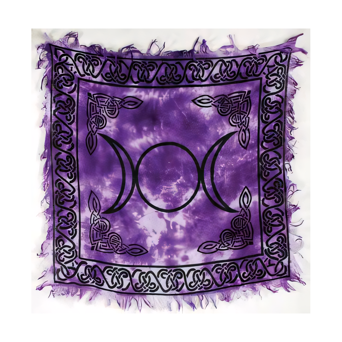 This is a square piece of violet tie-dyed fabric bordered with Celtic knotwork and a central Triple Moon design. The value is in how you use that visual structure.